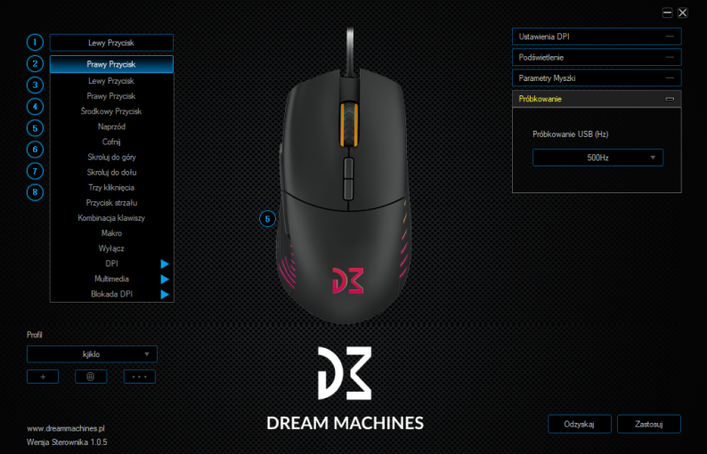 Програмне забезпечення Dream Machines, яке не тільки дозволяє змінити колір підсвітки, але й надає сотні можливостей конфігурацій для таких параметрів, як DPI, швидкість опитування та параметри макрокоманд.